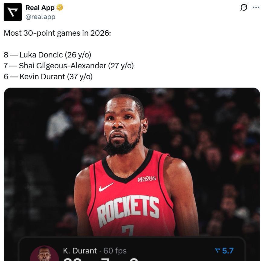 同时这也是杜兰特进入26年以来第6次单场砍下30+,高居联盟第三,仅次于东契奇(8次)和亚历山大(7次)。